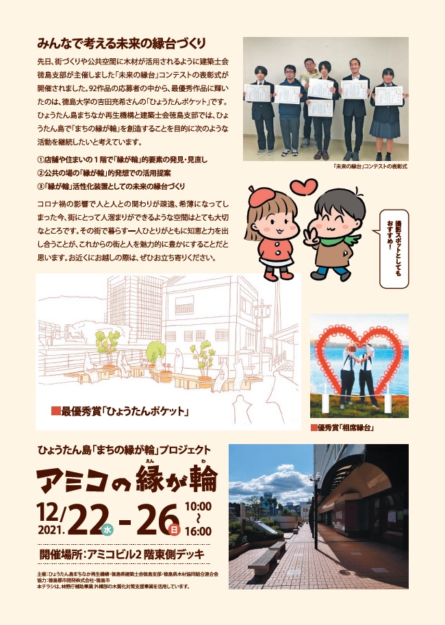 ひょうたん島「まちの縁が輪」プロジェクトとして、徳島県建築士会徳島支部が実施した「未来の縁台」コンテストで優秀賞に輝いた2作品について、徳島県産の木材を使用して制作し、令和3年12月22日(水)から26日(日)までの期間、アミコビル2回東側デッキにて展示します。